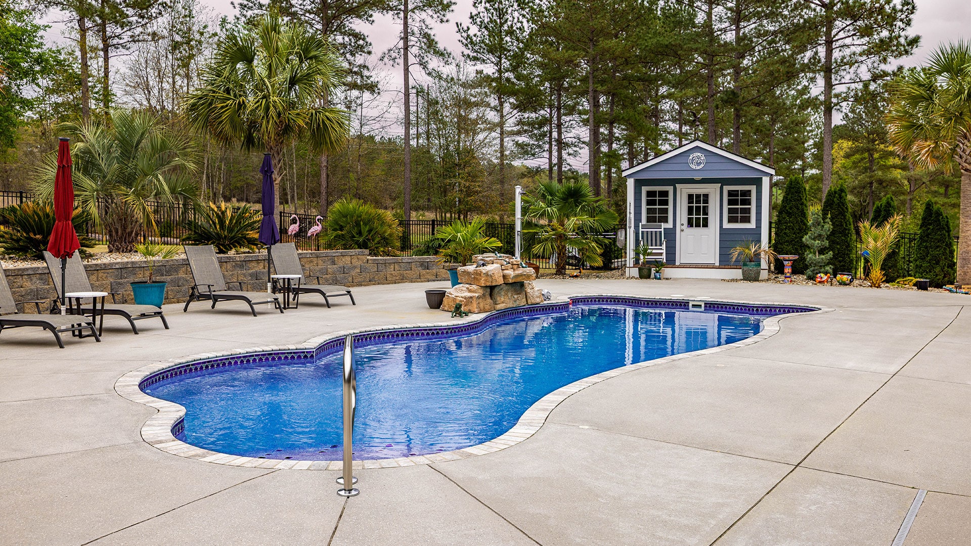 Welcome to the Castrogiovanni Project, where in-ground fiberglass swimming pools in Beech Island, South Carolina come to life in stunning style. Featuring the Synergy model pool, this project is complemented by a beautifully constructed retaining wall, built by Peachtree Pools, and a matching pool house for the ultimate backyard oasis. The customer’s attention to detail shines through with the surrounding concrete patio and lush palm trees, creating a tropical vibe that transforms this outdoor space into a paradise. From the pool to the landscaping, every element is designed to provide relaxation and elegance. Experience the beauty and craftsmanship of our in-ground fiberglass swimming pools in Beech Island, South Carolina, with the Castrogiovanni Project. Contact Peachtree Pools today to turn your backyard into a luxurious tropical retreat.